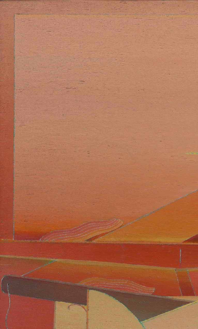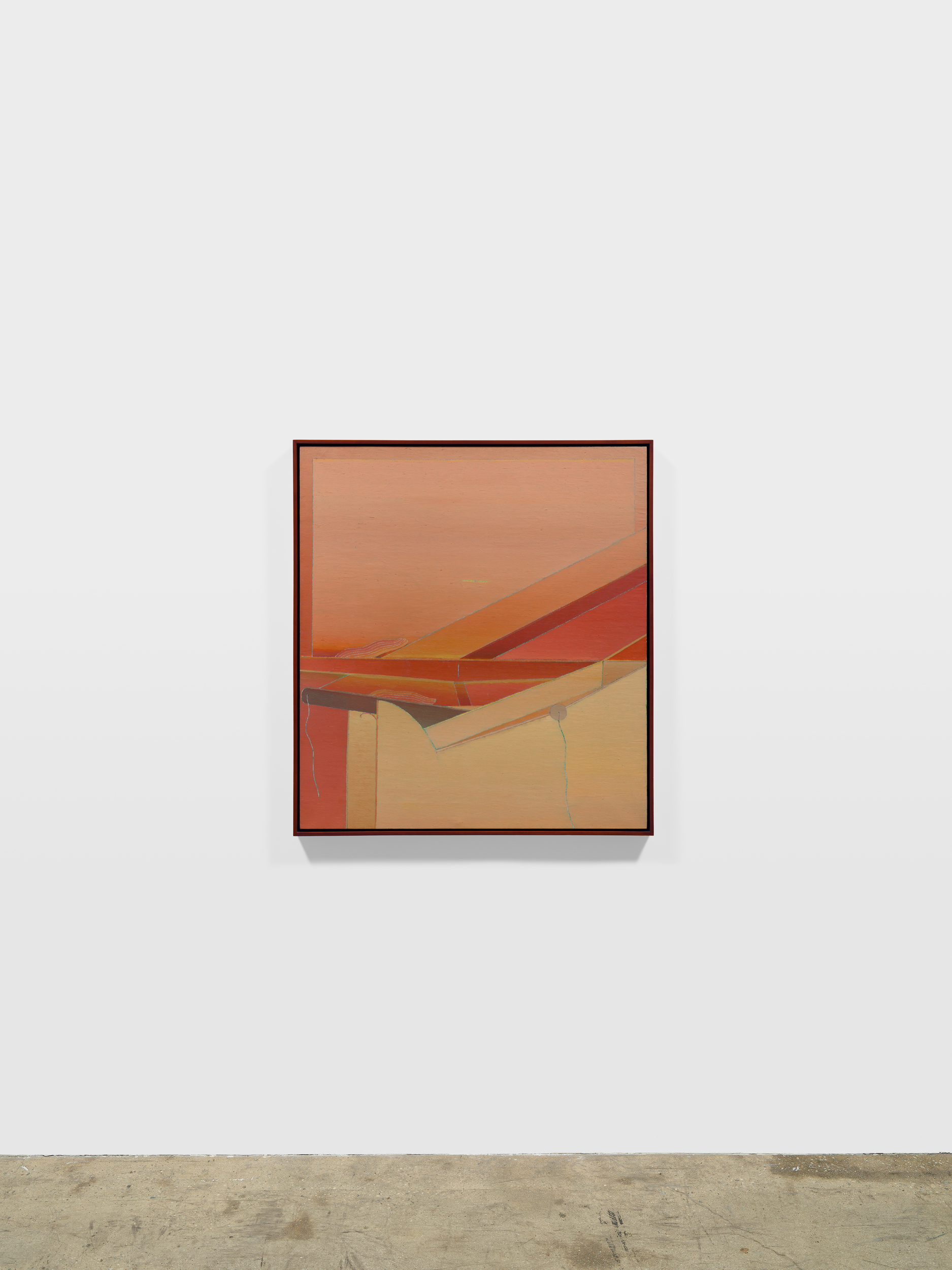 To encounter the late paintings of Miyoko Ito is to enter an uncanny space defined by restraint and precision. By the 1980s, Ito had refined her visual language into a disciplined interplay of biomorphic forms, structural armatures, and subdued, layered color. In works such as Untitled (1982), the composition unfolds within a shallow, stage-like interior where swelling silhouettes hover in careful relation to scaffold-like frameworks. The spatial cues are spare but deliberate—a faint horizon line, a subtle division of plane—establishing an interior without fully enclosing it.