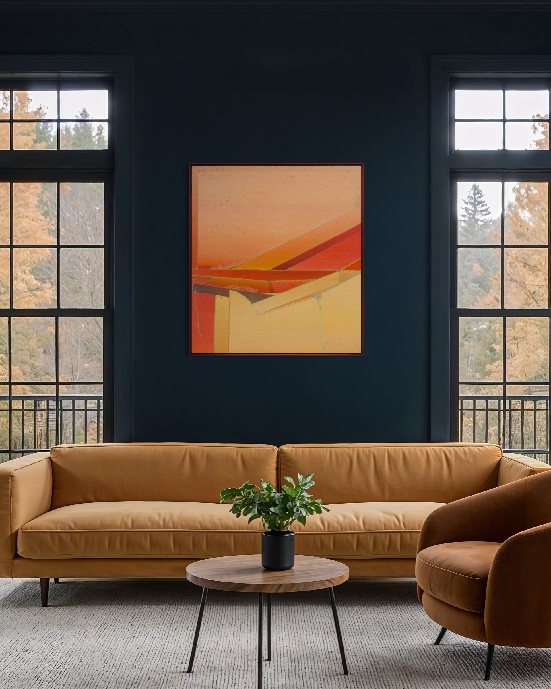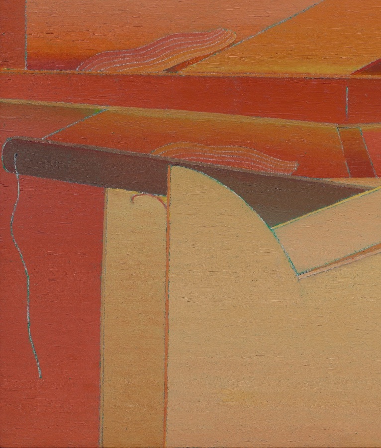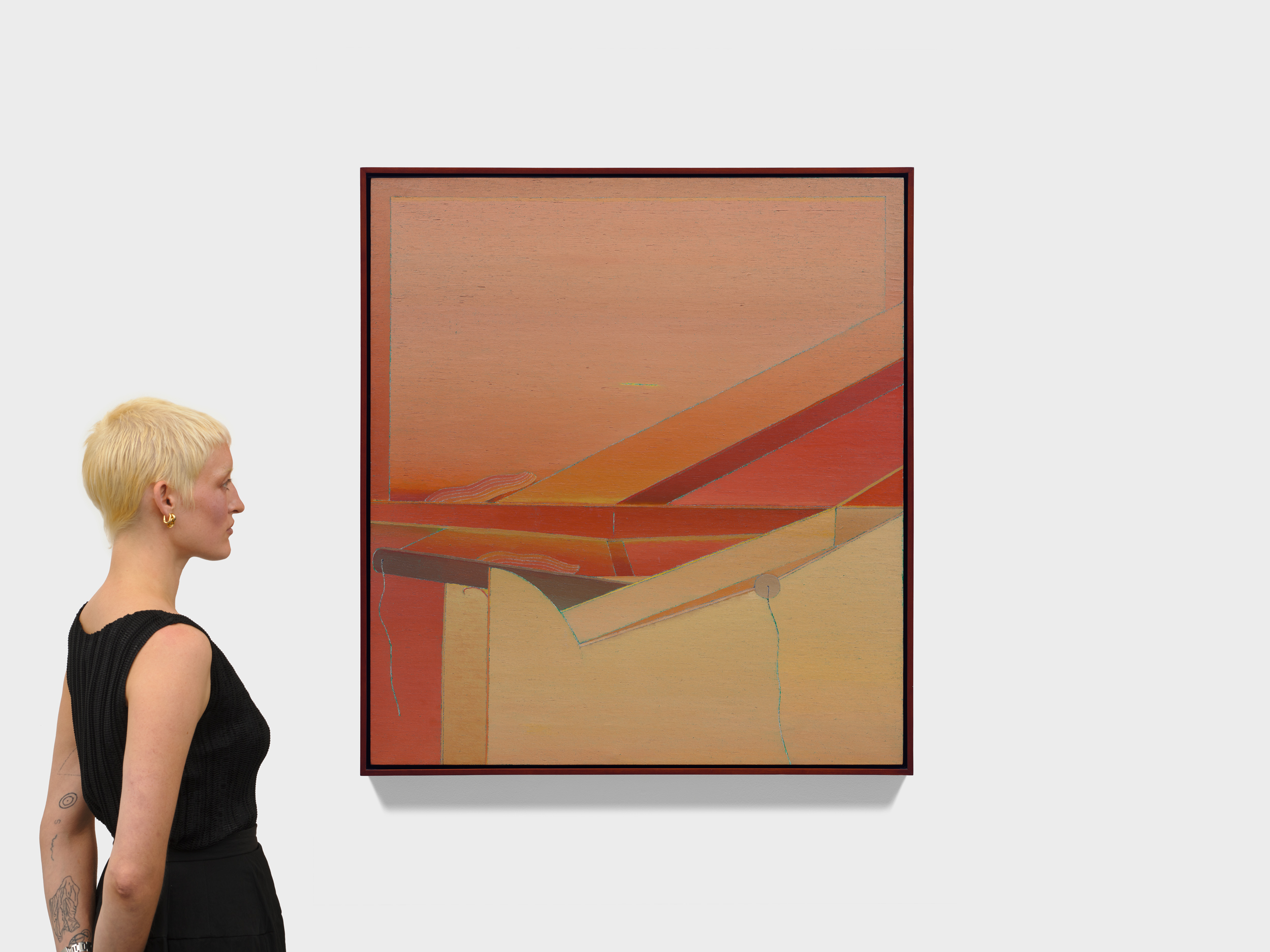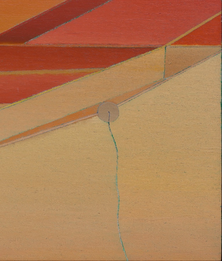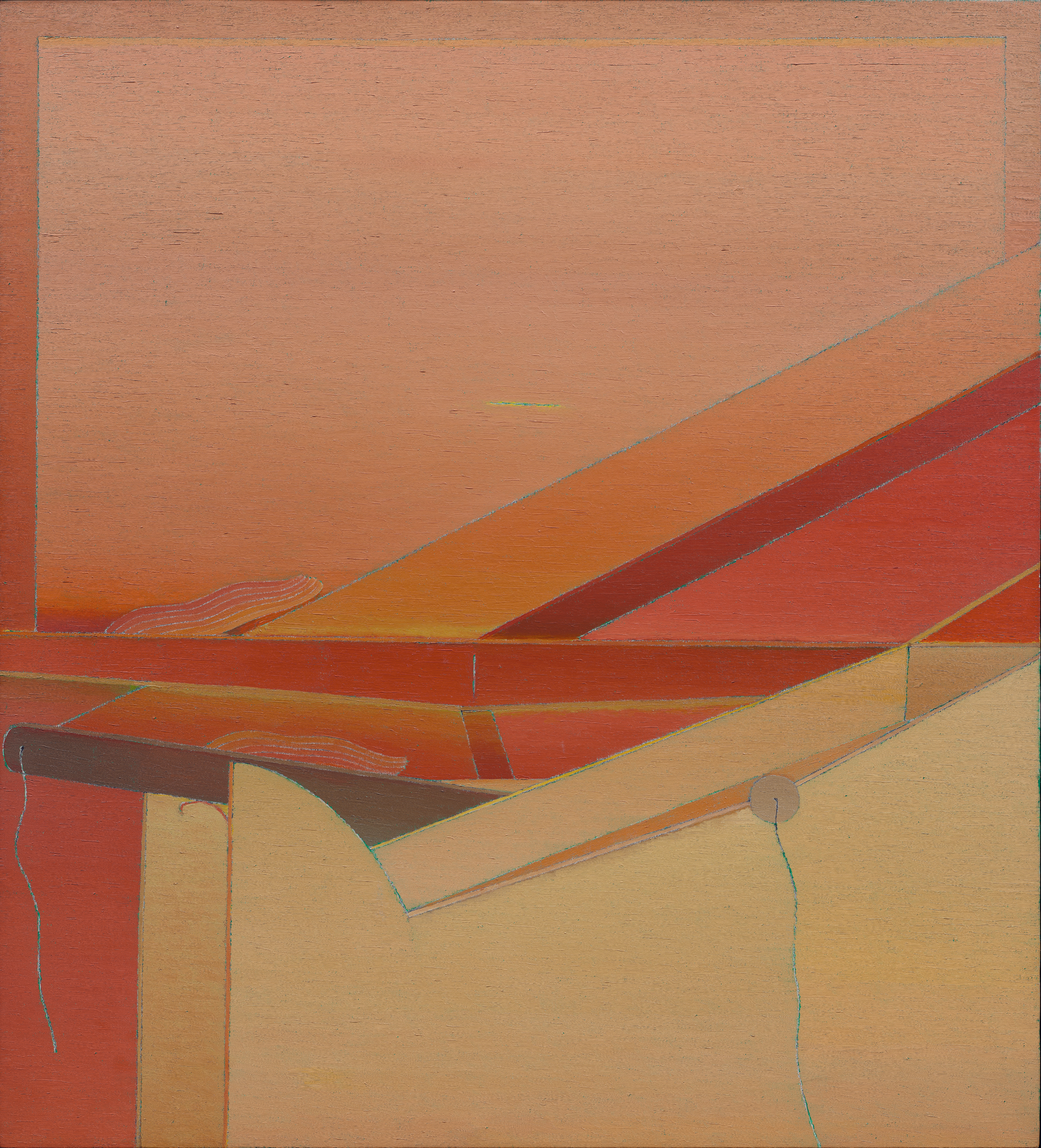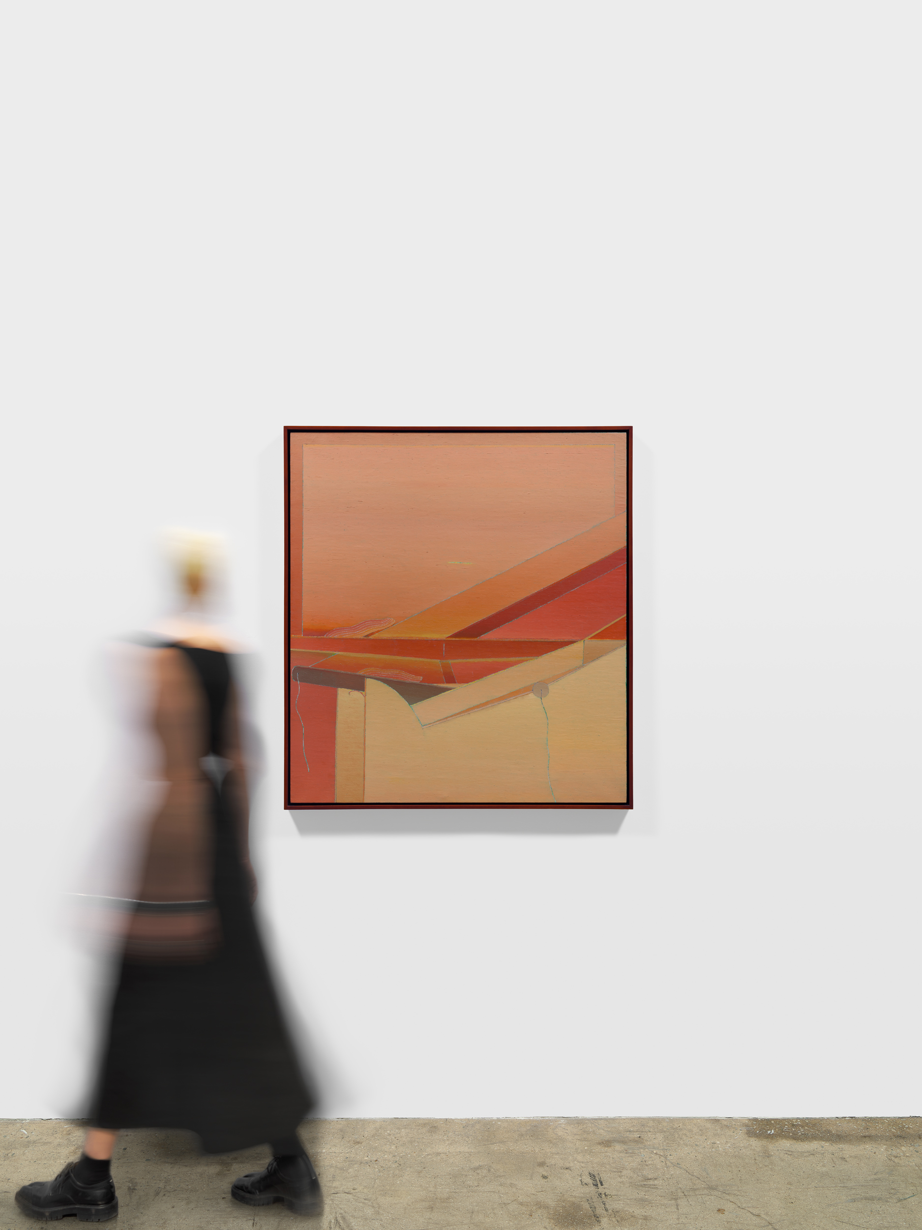 While she rarely spoke about the experience, and never depicted it directly, the echo of that rupture hovers at the edge of her mature work. Her paintings frequently present enclosed, shallow environments — interiors held in careful balance, where forms exist under sustained tension. “Every time I have a problem, I go deeper and deeper into painting,” she once said. “I have no place to take myself except painting.” The statement underscores the intensity of her commitment, with the canvas serving as both sanctuary and crucible. Rather than dramatize emotion, Ito condensed it. Her late canvases hold their forms in quiet suspension, balancing organic silhouettes against architectural scaffolds, translucence against line. The tension remains controlled, the atmosphere sustained.