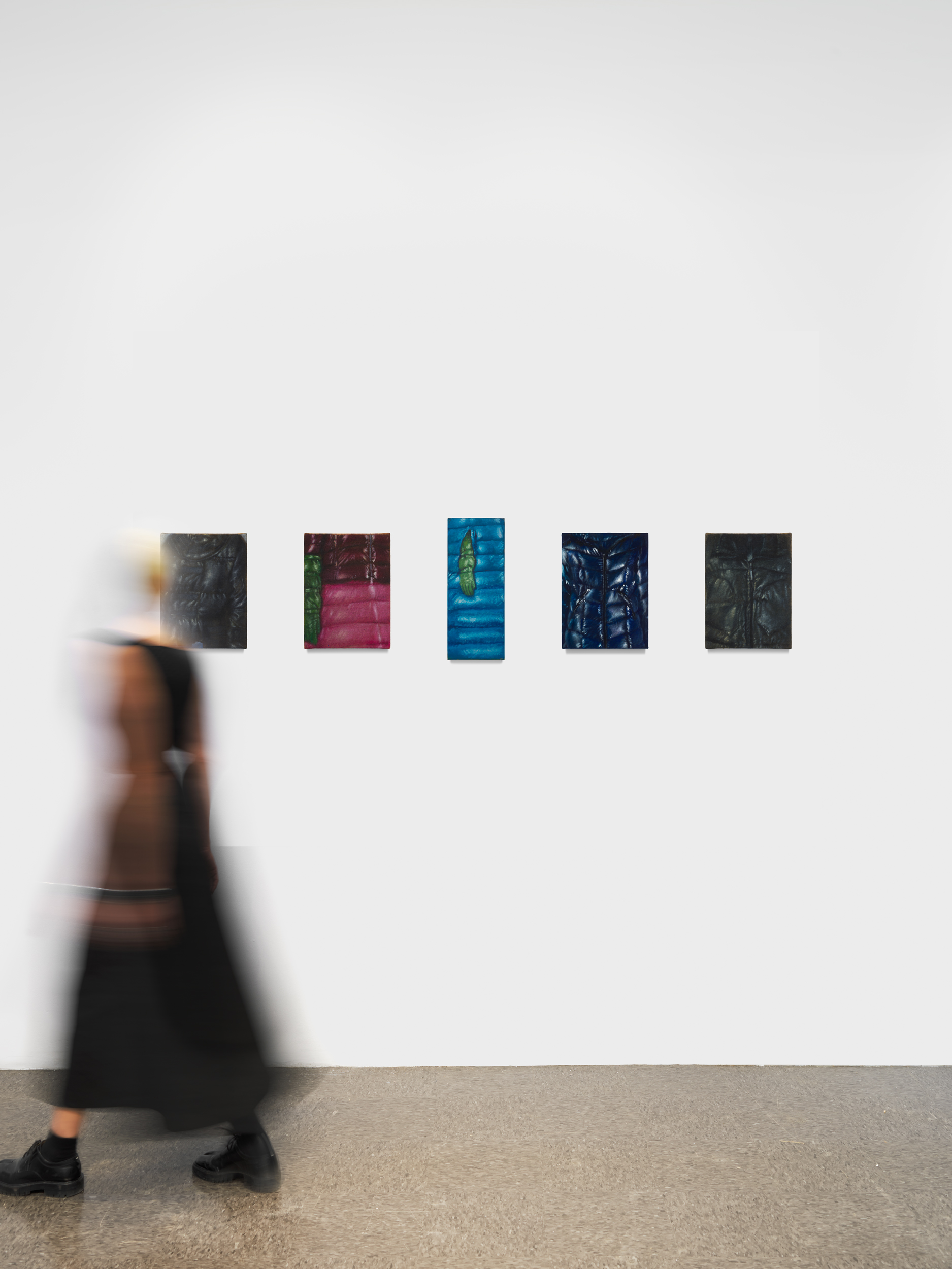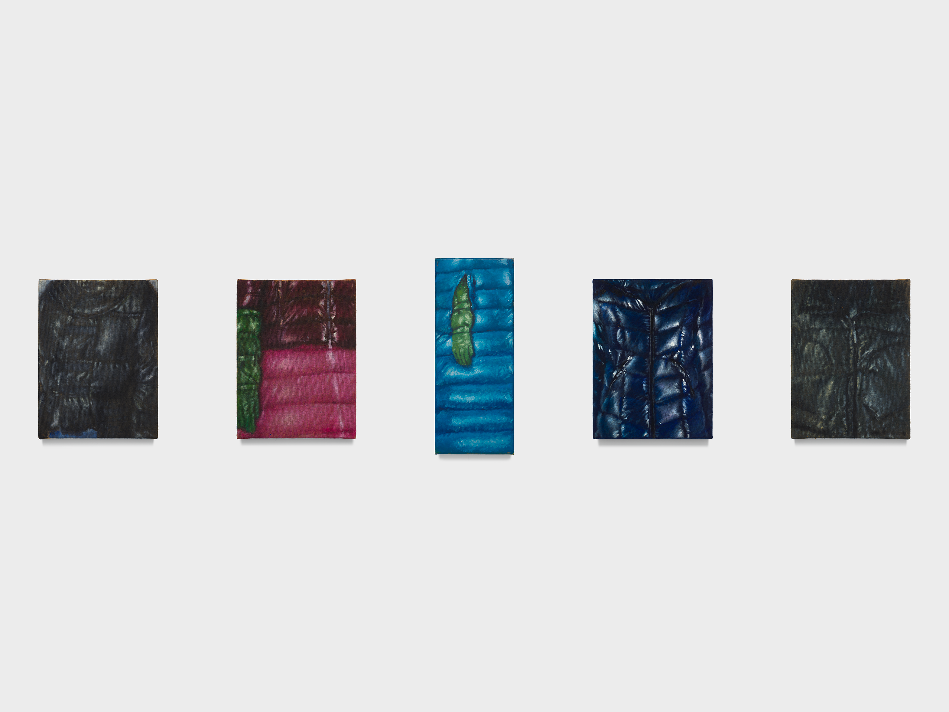Sourced from fashion imagery and digital retail platforms, the jackets echo the language of e-commerce: isolated, polished, and suspended in neutral space. Yet Wood subtly undermines this commercial seduction. The garments feel overstuffed, airless, almost strained—less aspirational than claustrophobic. In this way, Recent Jackets aligns with Wood’s broader exploration of consumer objects as vessels for identity projection and emotional regulation.