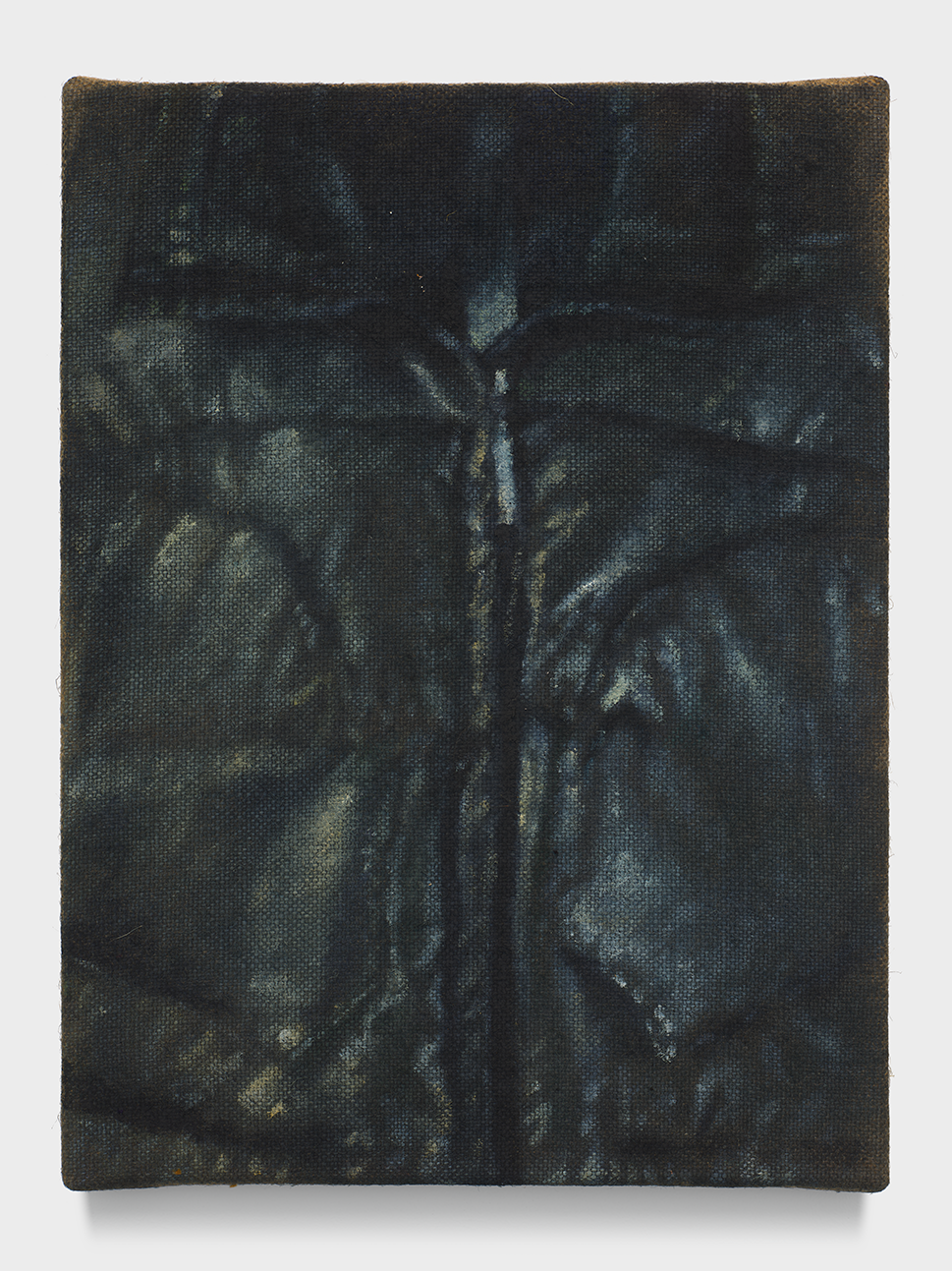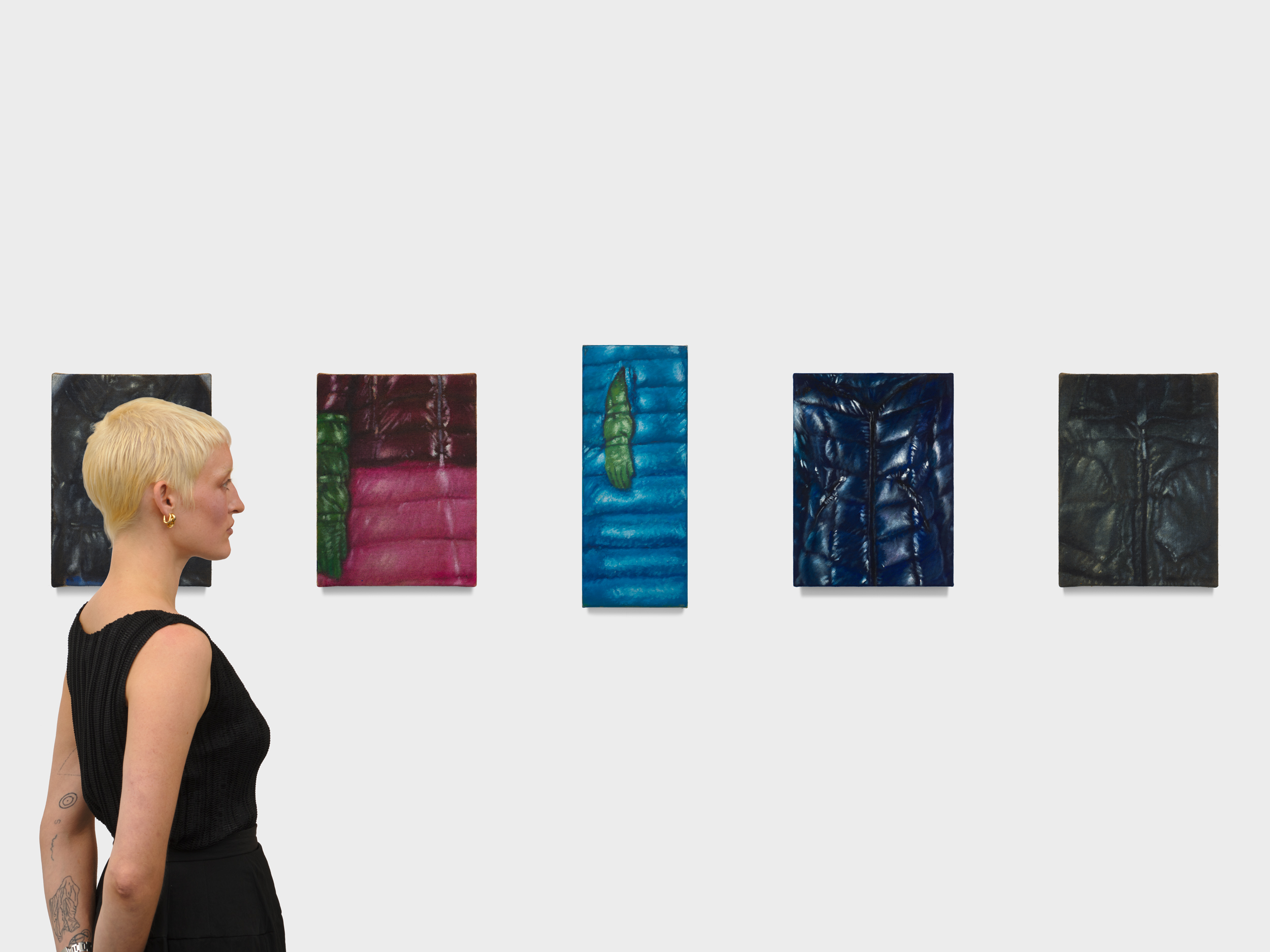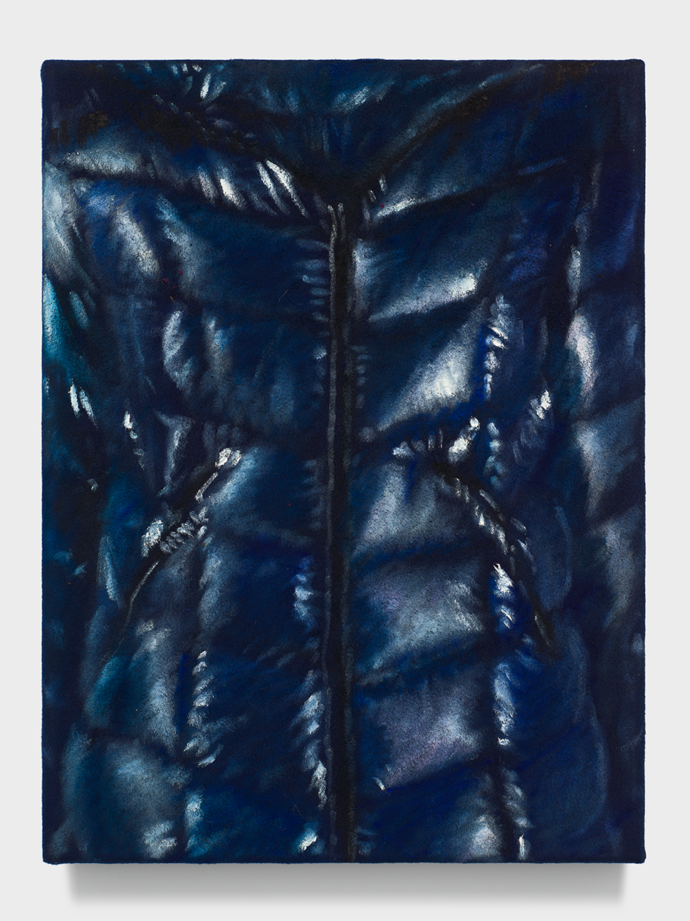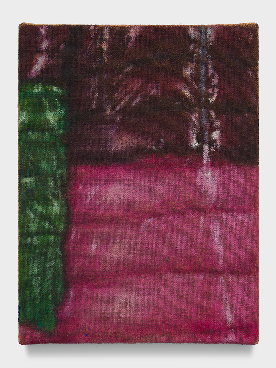 Wood’s jackets are rendered close-up and without wearers, their tight framing amplifying a sense of compression and restraint. Seams, quilting, and zippers become compositional anchors, suggesting containment rather than comfort. Painted across varied supports, the surfaces oscillate between softness and resistance. Velvet absorbs light and depth, while burlap and linen assert their material roughness, complicating the illusion of glossy, insulated fabric. This interplay heightens the tension between allure and unease that runs throughout Wood’s practice.