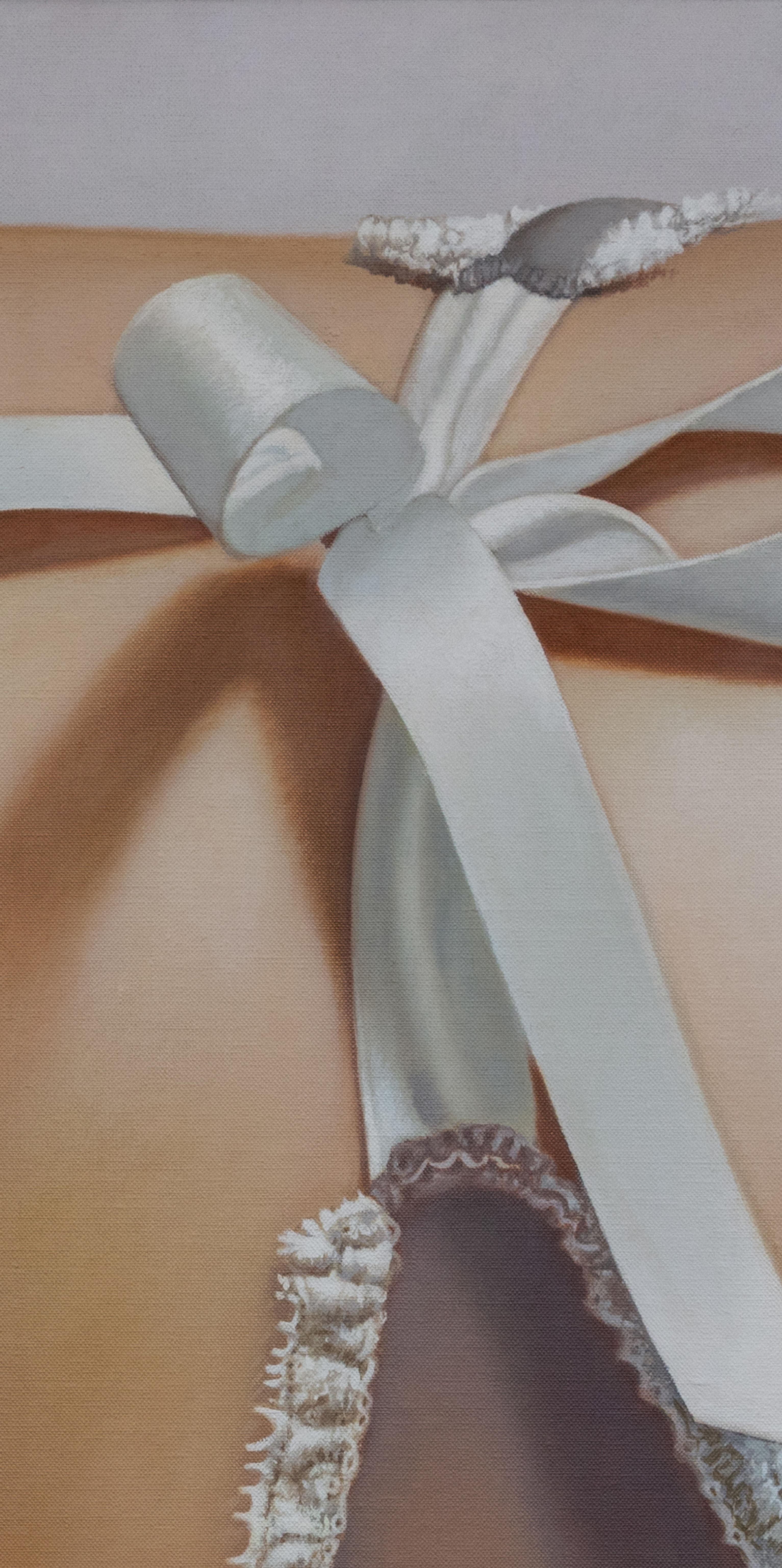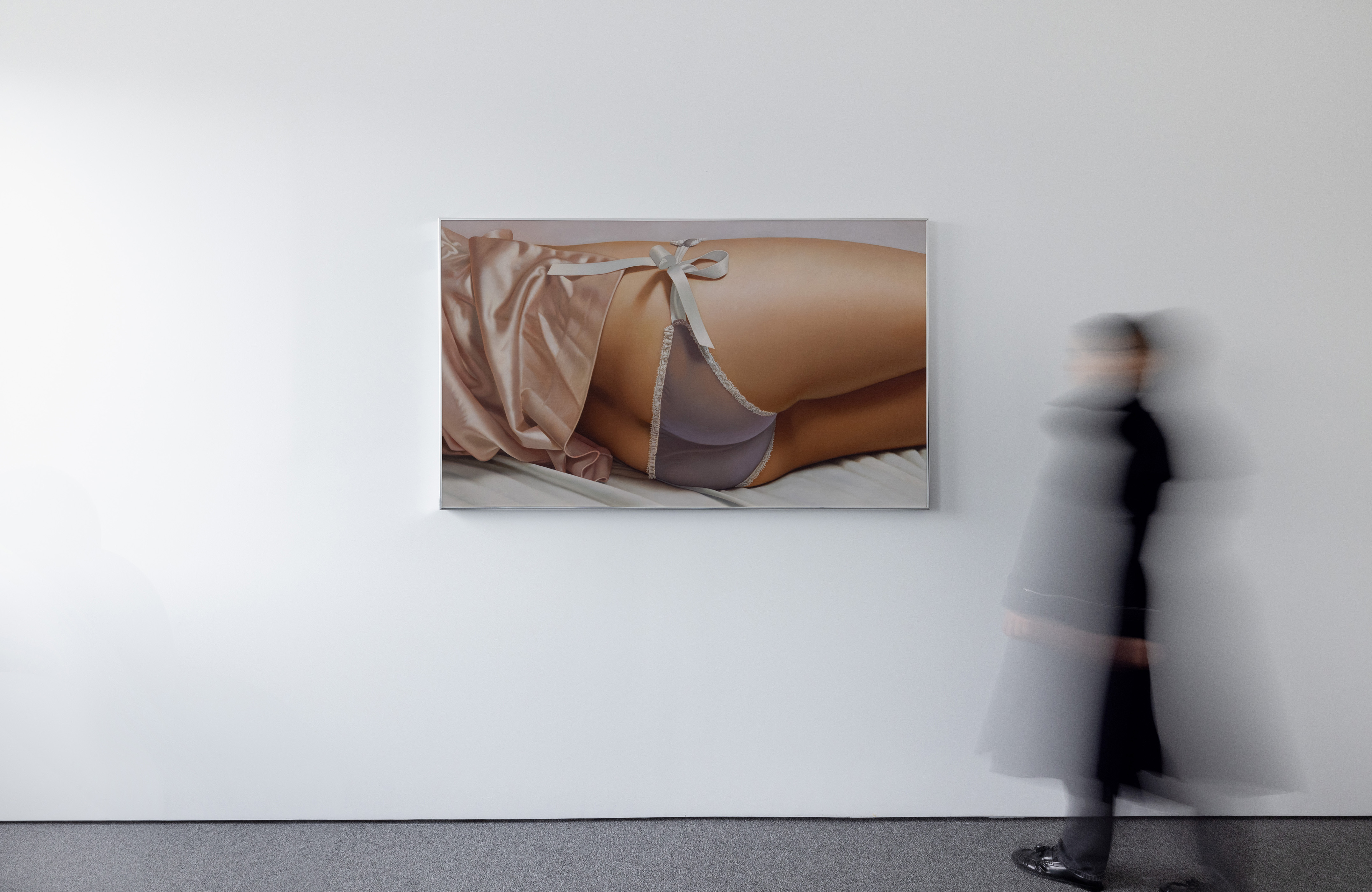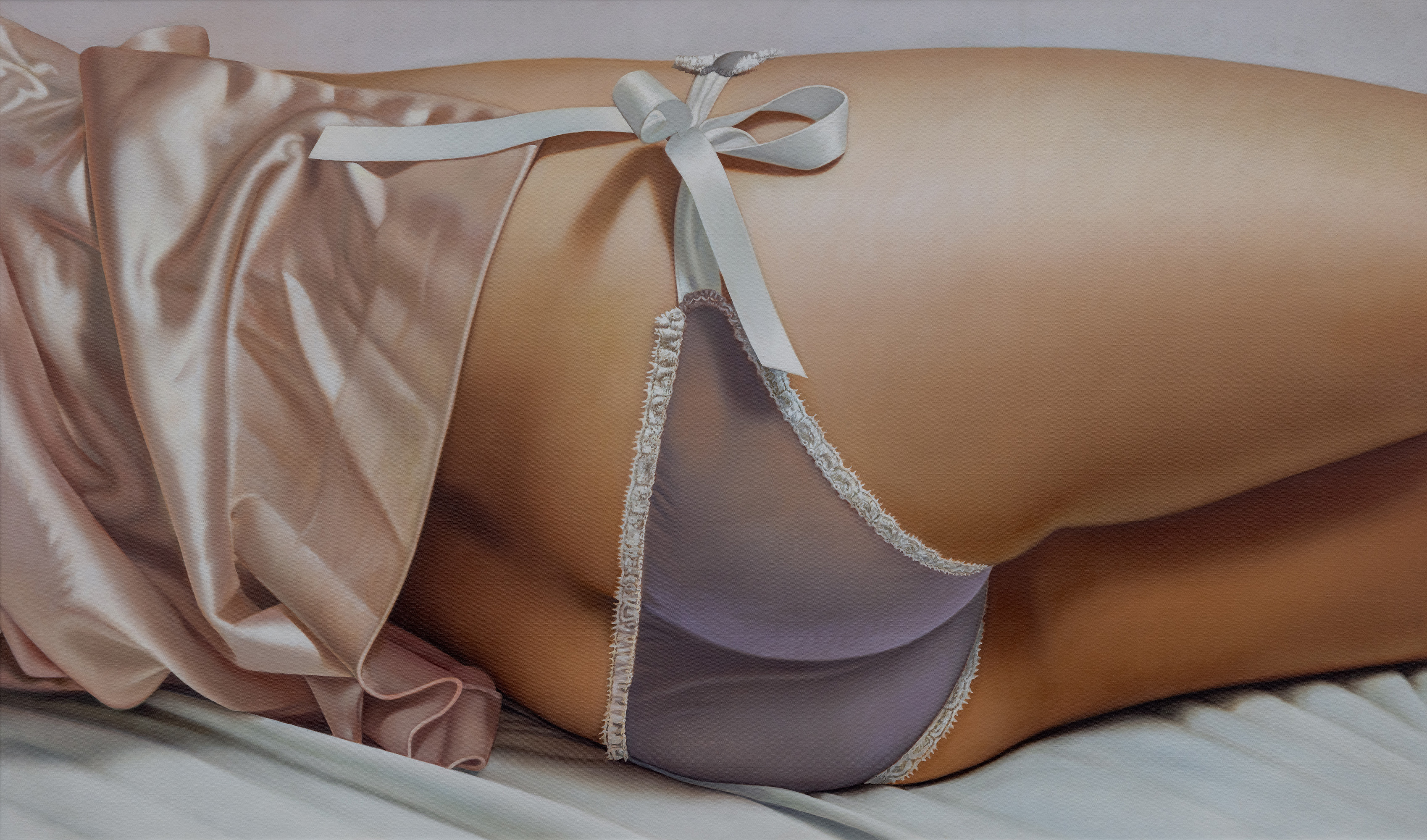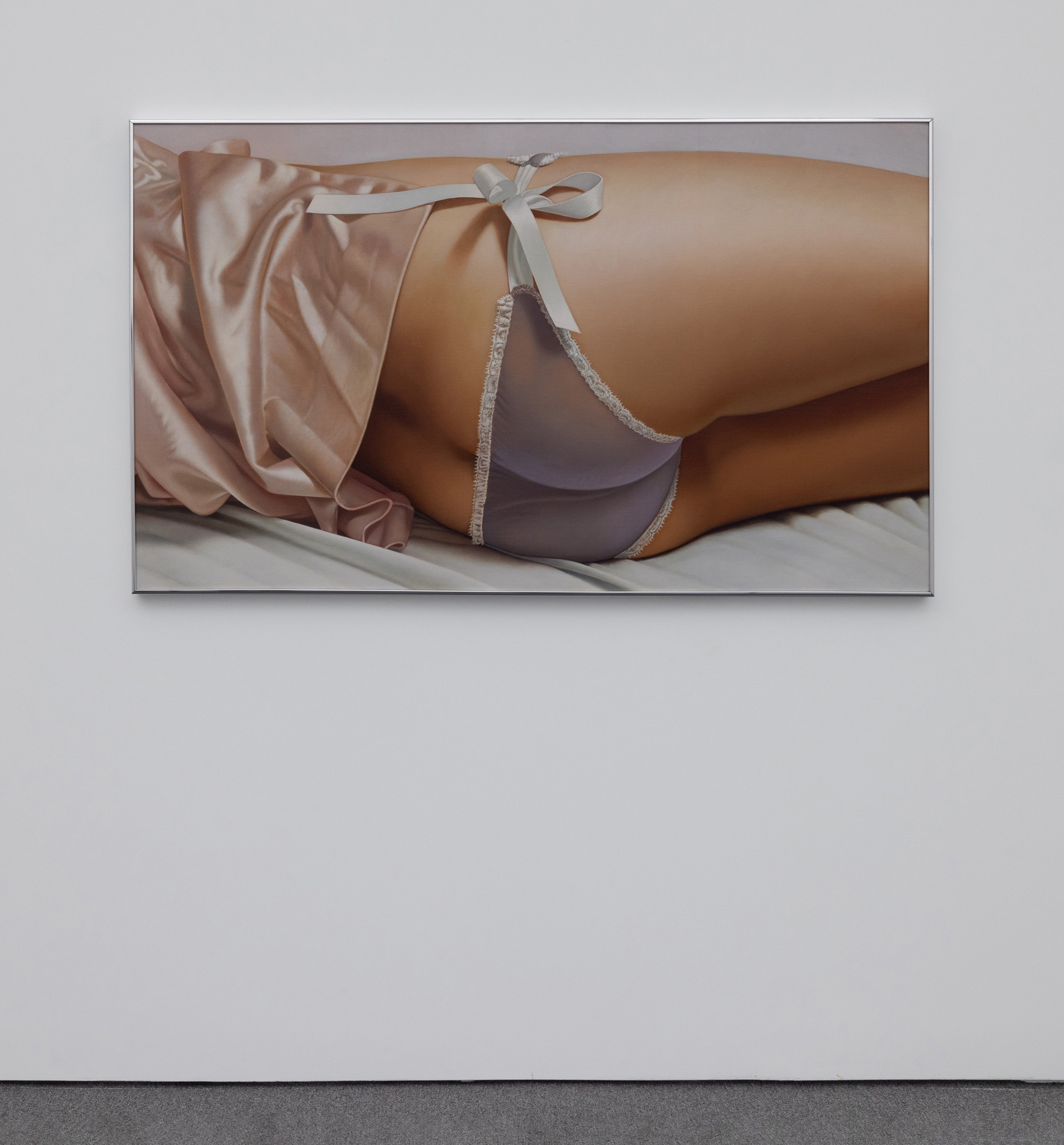 Two years later, Kacere would begin his series dedicated to the female form, distilled from the bottom of the rib cage to the mid thigh and monumentally scaled. Accentuating the feminine form with meticulous attention to detail, the larger-than-life figures adorned in glossy ripped fabrics and gauzy briefs extend beyond the realm of typical nude study, lingering on the verge of still life or landscape.